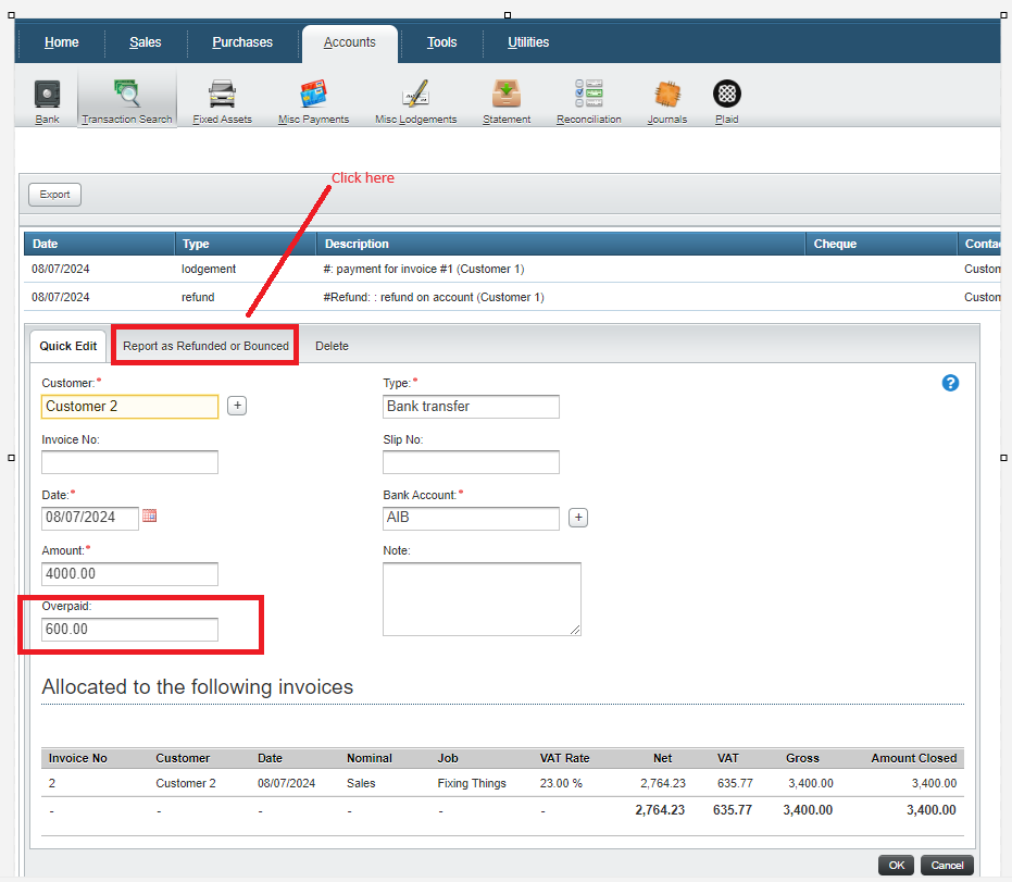 Now click Report as Refunded or Bounced, select refund and pick the date