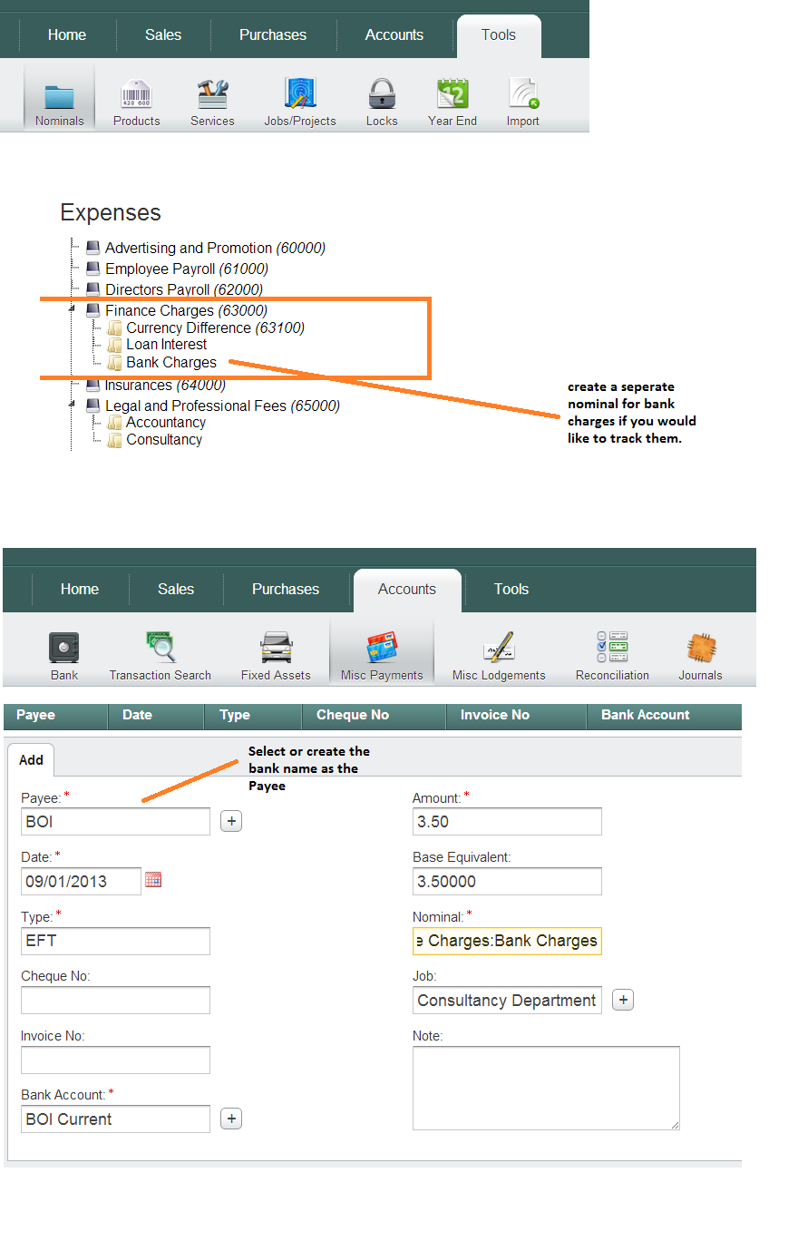 If you like, you can select Tools. Nominals to create a separate nominal for bank charges in order to track them